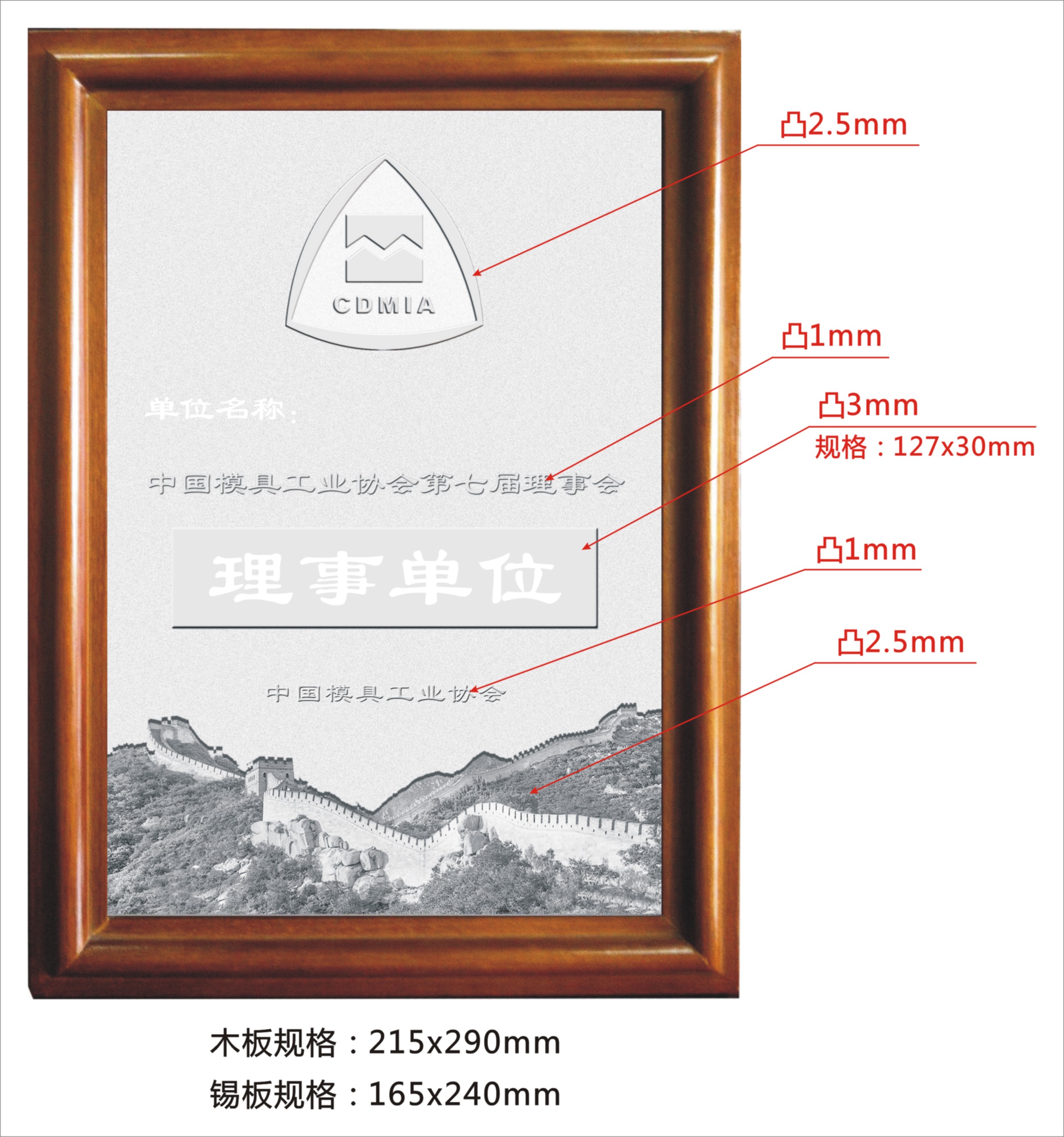 中國模具工業協會第七屆理事會換屆后,為規范協會的管理,增強理事、常務理事、會長、副會長的責任感、榮譽感。我們為選為理事、常務理事、會長、副會長頒發了任職證書。同時決定為理事單位、常務理事單位、會長單位、副會長單位制作標牌??紤]到換屆后理事、常務理事的增補和調整,標牌制作作了適當延遲?,F在標牌已完成設計制作方案(見標牌式樣效果圖,標牌材質采用錫版模具壓制,單位名稱和職務名稱由北京精雕科技集團有限公司雕刻并開始制作),準備在今年10月北京召開的七屆第三次理事會上頒發。由于制作工作量大、時間緊,將視各單位交納會費情況優先制作發放。希望還沒有按規定交納會費的單位盡快辦理交納會費。并及時與中國模協聯系。