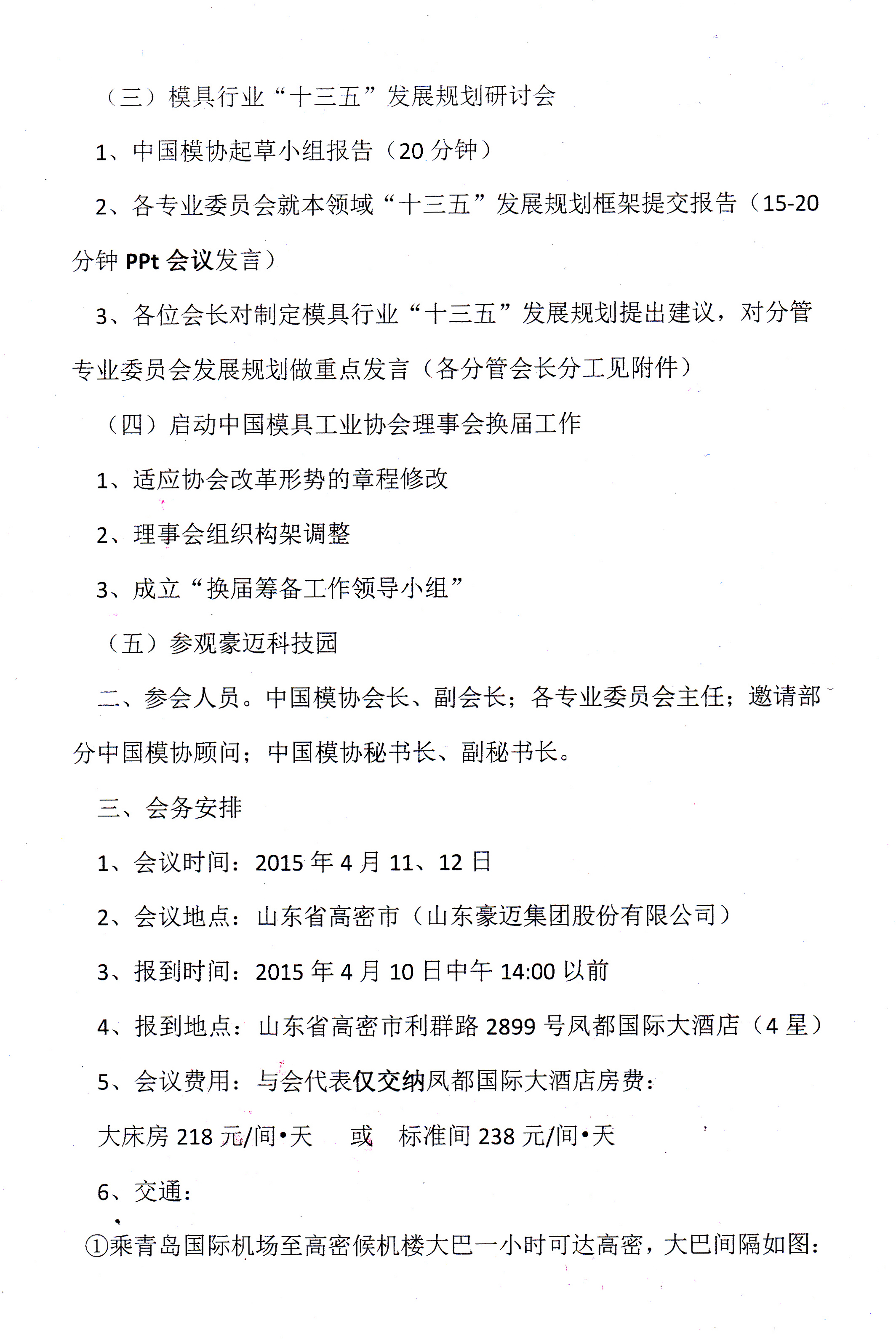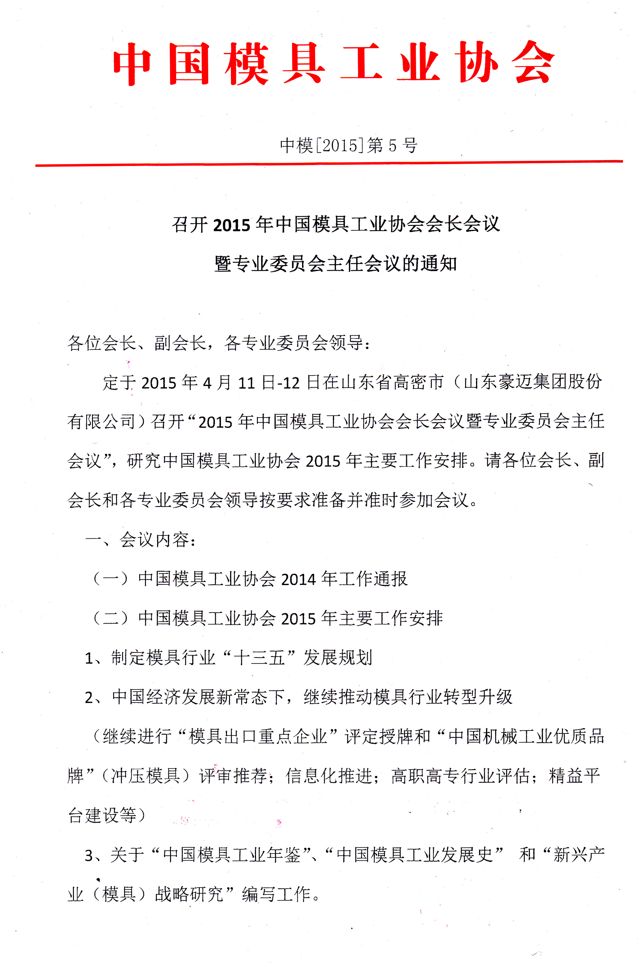 召開2015年中國模具工業協會會長會議暨專業委員會主任會議的通知