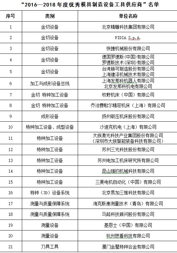 在知名品牌專業展會——中國國際模具技術和設備展覽會DMC上開展優秀供應商的評選活動,得到了各行業的廣泛認可,被評定為優秀供應商的企業,將在模具企業的采購中獲得優先推薦資格并在行業里得到廣泛的宣傳推廣,并在中國模協的官網上進行公告,至今已成定式。DMC2018期間,中國模具工業協會委托中國模協裝備委員會、數字化信息化委員會、材料委員會,本著自愿的原則,依據供應商的技術水平、在模具行業的服務能力、市場占有率的高低、模具行業服務滿意度等行業貢獻指標,并結合模具企業的意見,最終評選出21家“2016—2018年度優秀模具制造設備工具供應商”、3家“2016—2018年度優秀模具設計制造管理軟件供應商”、16家“2016—2018年度優秀模具材料供應商”(同時見www.cdmia.com.cn,diemouldchina.com.cn),具體名單如下所示,排名均不分先后。