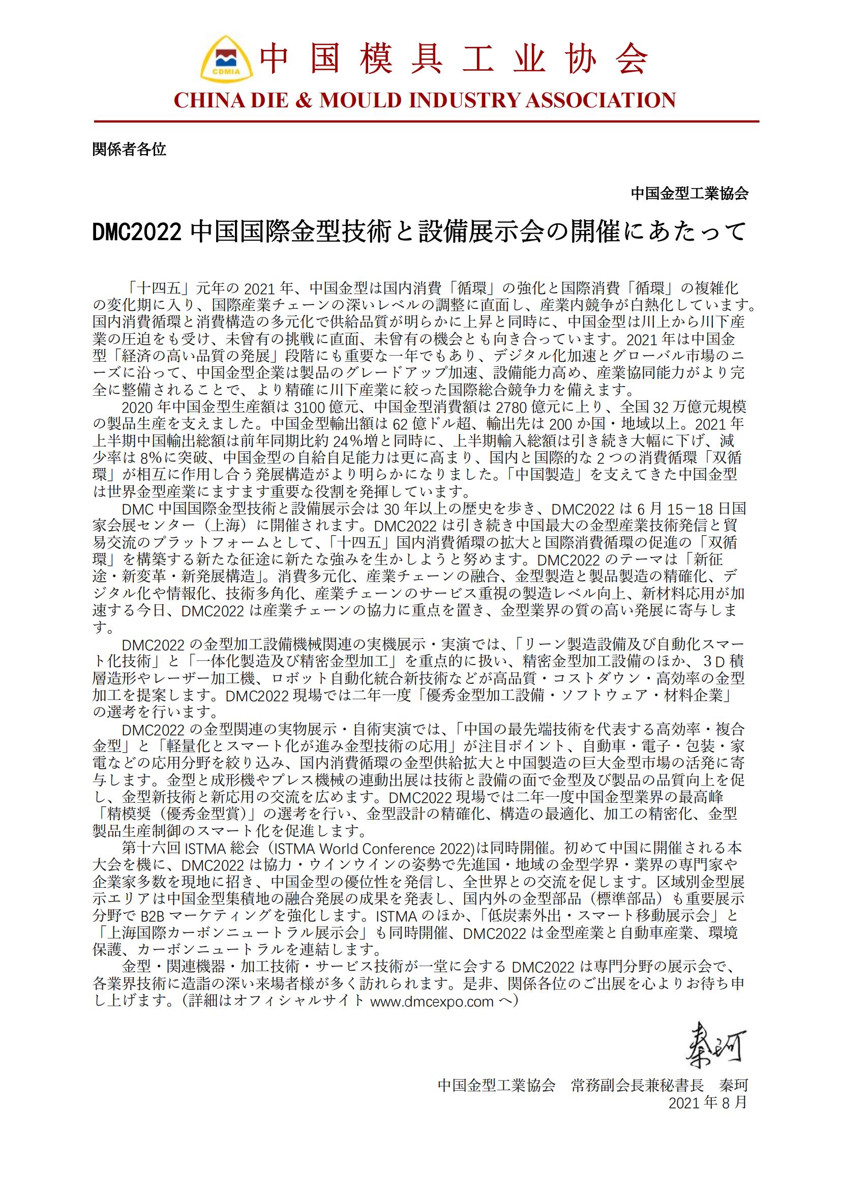 DMC2022 中國國際金型技術と設備展示會の開催にあたって