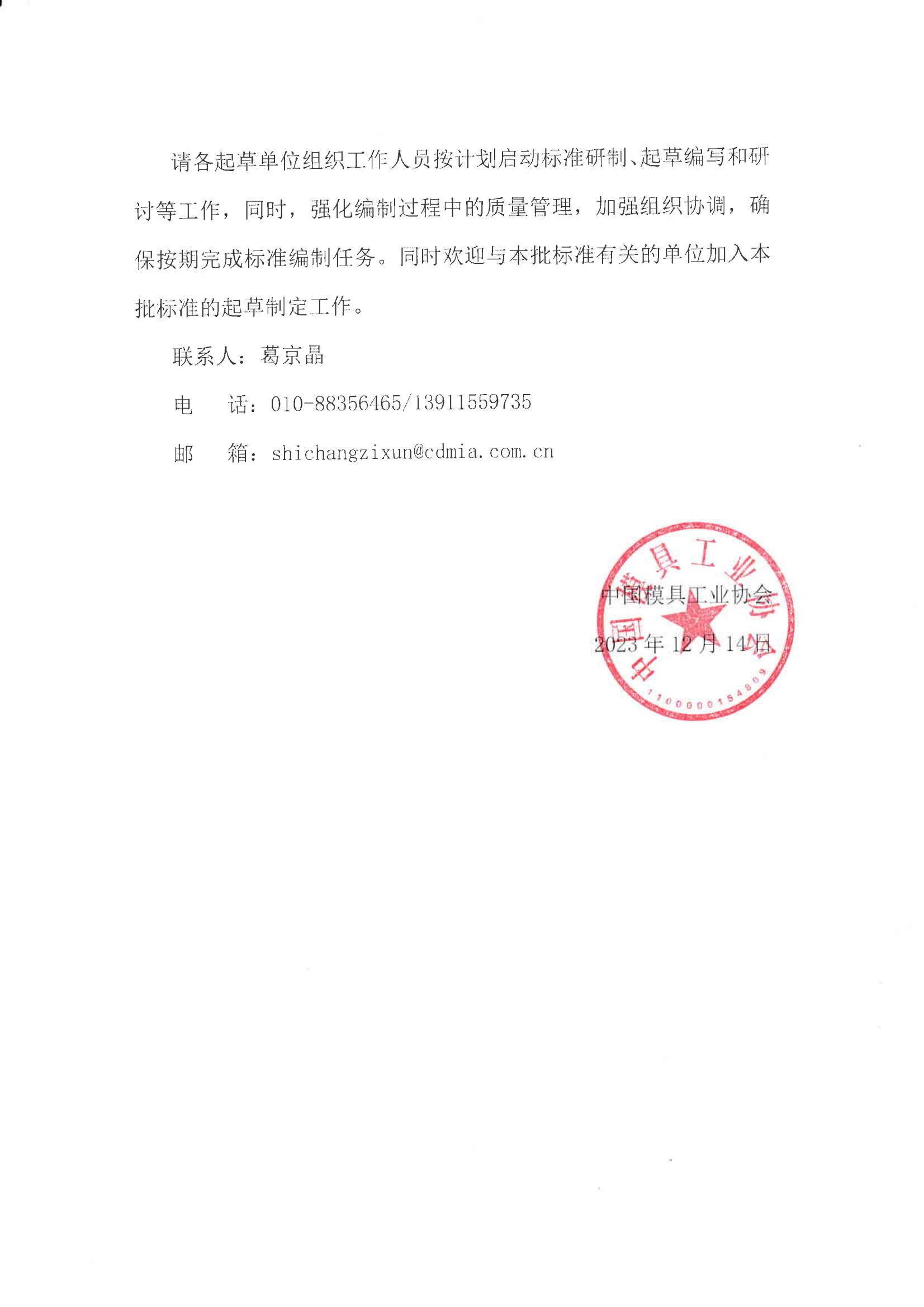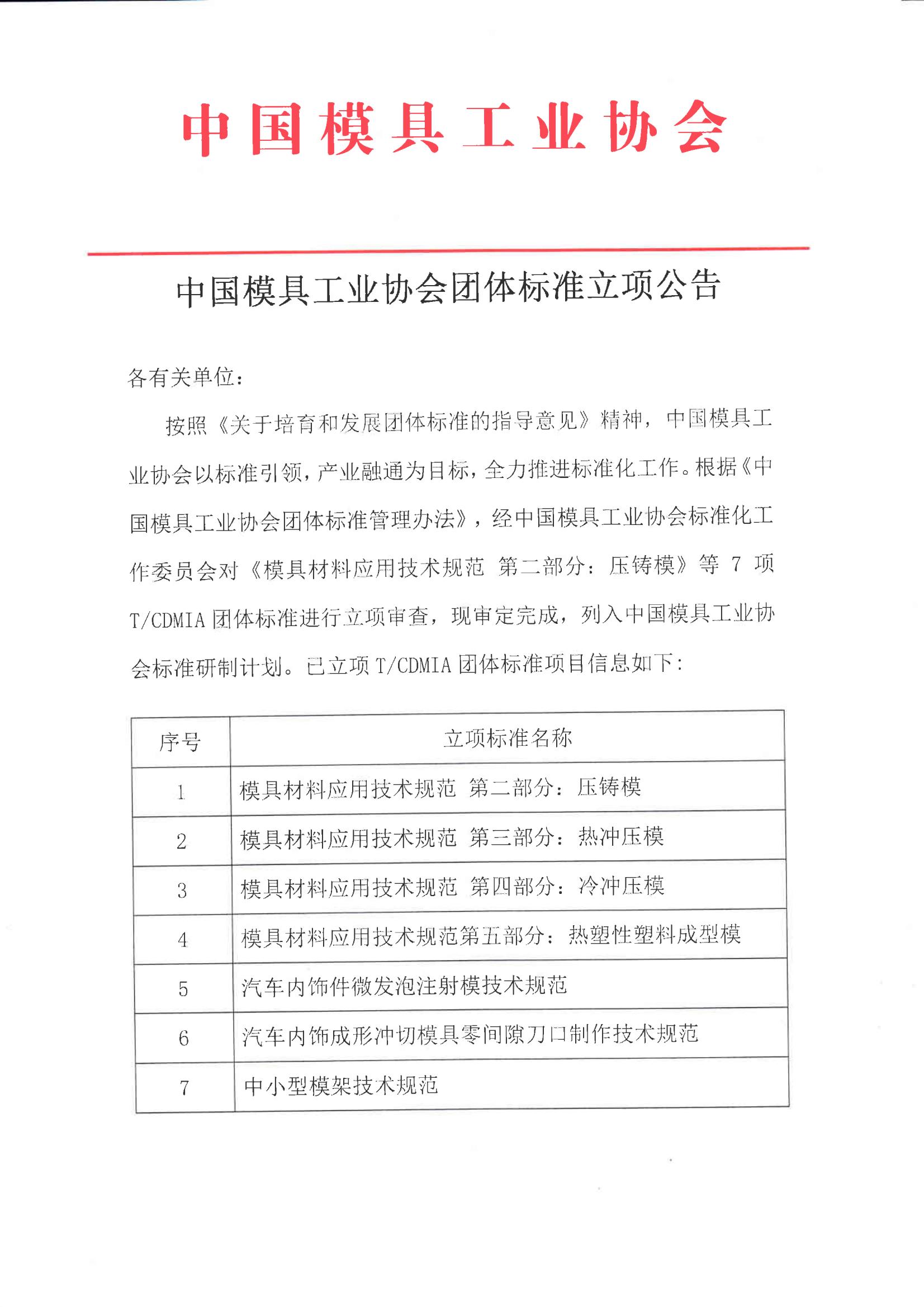 中國模具工業協會團體標準立項公告