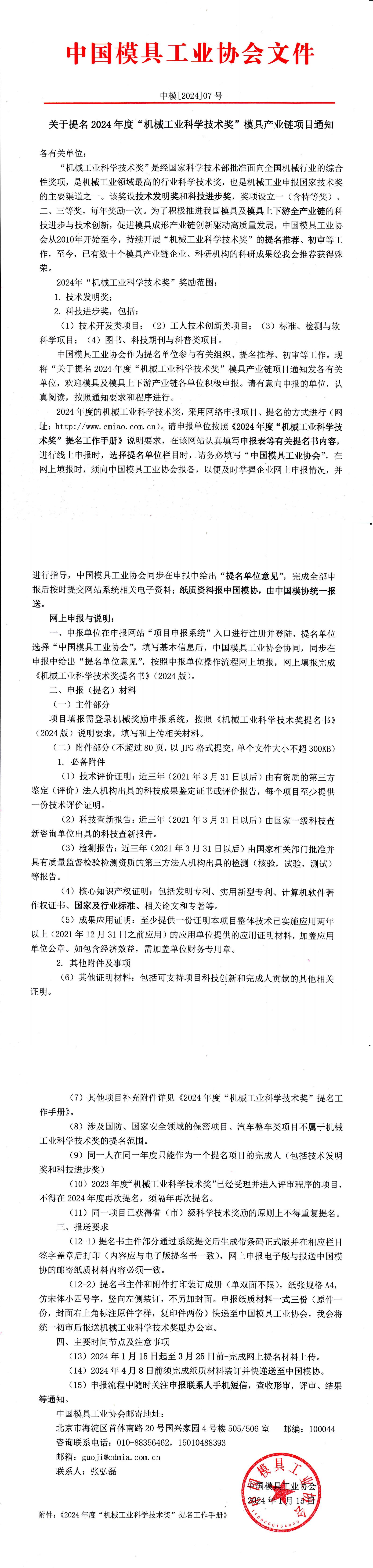 關于提名2024年度“機械工業科學技術獎”模具產業鏈項目通知