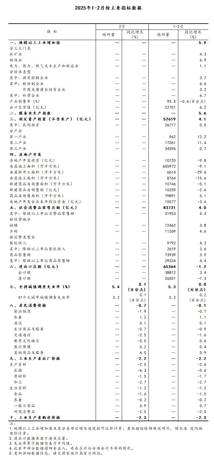 1-2月份,在以習近平同志為核心的黨中央堅強領導下,各地區各部門深入貫徹落實黨中央、國務院決策部署,堅持穩中求進工作總基調,完整準確全面貫徹新發展理念,加快構建新發展格局,扎實推動高質量發展,一攬子存量政策和增量政策繼續發力顯效,工業服務業較快增長,消費投資繼續改善,就業形勢總體穩定,新質生產力成長壯大,經濟運行起步平穩,發展態勢向新向好。
